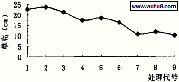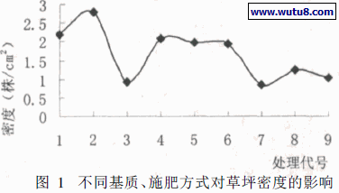 从图1 ( 所有图中处理代号1 为A1B1、2 为A1B2、3为A1B3、4 为A2B1、5 为A2 B2、6为A2B3、7为A3 B1、8为A3B2、9为A3B3 )发现, A 因素中的3个水平A1 有利于提高草皮密度, 其次是A2, A3 最差; B因素中B2 有助于提高草皮密度, B1 和B3 效果不太明显。互作效果明显, 最优组合为A1B2, 它们与其它组合间有显著差异。这说明以草碳为基质, 配合中等施肥量, 有利于草坪草出苗和幼苗发育, 从而提高草皮密度。