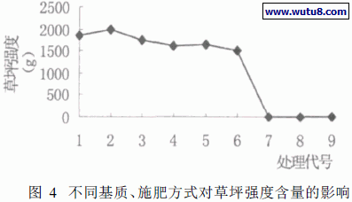 11513 根系鲜重 草地早熟禾的根系是须根系, 通过大量的须根絮结到一起形成草毯, 因此草坪草根系的重量, 直接影响草皮的强度。本试验在各小区随机抽取3个1cm2 的样方, 测出草坪草根系的平均鲜重, 并进行方差分析。