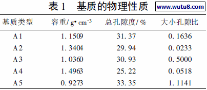 由表1 可知, 基质A4 和A2 的容重最大, 保水性最好, 其次是A1 和A3, 容重最小的是A5,保水性最差; 基质A5, A1, A3 和A2 的总孔隙度较大, 透气性较好, 而A4 的总孔隙度较小, 透气性较差; 基质A5 的大小孔隙比最大, 其次是A3,A1, A4, A2。