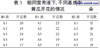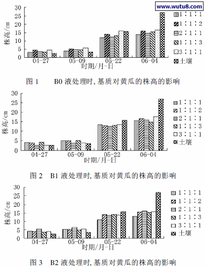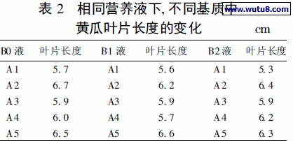 2010 年在黑龙江省农业科学院齐齐哈尔分院实验室选用" 津春3 号"的黄瓜种子, 以陶粒、珍珠岩、沙子为基质, 分别按照1:1:1; 1:1:2; 2:1:1; 1:1:3; 3:1:1的比例混合, 并标记为A1、A2、A3、A4、A5, 种入已发芽的黄瓜种子, 同时, 配制3种不同氮浓度的营养液, 分别为B0 液( 标准营养液) , B1 液( 氮浓度降低1 倍) 和B2 液( 氮浓度升高1 倍) , 定期用营养液和水交替浇灌, 以常规土壤栽培为对照, 并测定黄瓜生长过程中的各项形态和生理指标( 株高、叶片长度、开花数、根冠体积、叶绿素) 。