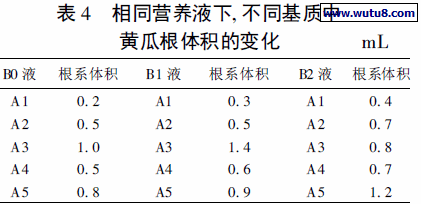 由表4 可知, 在营养液相同的条件下, 基质A3和基质A5 的黄瓜植株根系体积最大, 其次是基质A4 和A2, 根系体积最小的是基质A1。由此可知,基质A3 和基质A5 有利于植株根系的生长。