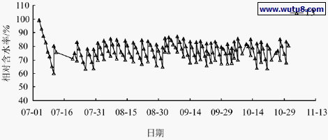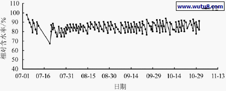本文以基质持水量作为上限控制各处理灌水定额。试验于2009 年7 月4 日移栽时开始,至2009 年11 月5 日结束,共历时124 d。供试种苗摆放密度为苗期15 盆/m2、后期10 盆/m2,移栽时种苗高18 cm 左右,长势均一。采用出水量为3.85 L/h 的压力补偿式滴头(工作压力范围为0.05~3 MPa),配以4 个出水口的平口多孔管,用统一长度1 m 的芒管连接滴箭,侧向浅插入花盆基质1 cm 左右的花卉根系中心区域供水,按照相应控制下限,将基质持水率作为上限确定灌水定额。花盆置于托架上,托架下放置聚氯乙烯(PVC)盛水器收集渗漏水。每个处理5 次重复,监测样株两侧设置保护行,采用带有压力罐的自吸式稳压水泵为动力,应用美国产水力驱动的比例施肥泵实现随水施肥,所有试验小区随机分布,耕作、施肥、病虫害防治处理措施均相同。