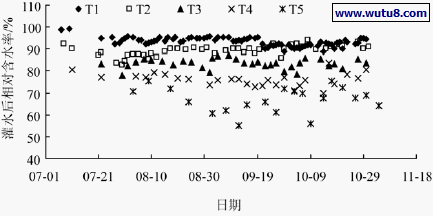 试验开始时,各处理基质基础含水率统一调整为基质持水量。7 月4 日到7 月7 日各处理均未灌水,从图1可以看出,处理间基质含水率差异不大;7 月7 日至7 月12 日,T1、T2 和T3 先后达到灌水下限实施灌水,3 个处理基质含水率从T1 到T3 依次降低,均高于未灌水且含水率差异不大的T4 和T5。7 月20 日以后,基质含水率总体表现为T1 的82%~96%θFC、T2 的75%~94%θFC、T3 的64%~88%θFC、T4 的56%~80%θFC 和T5 的44%~76%θFC 之间,总体表现为自T1 到T5 随着灌水下限的降低而降低。与Karam F 等取得的灌水下限对土壤含水率的影响研究结果一致[15]。