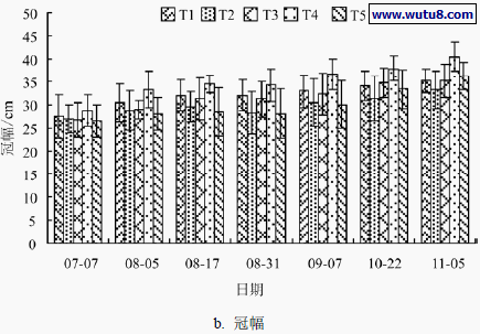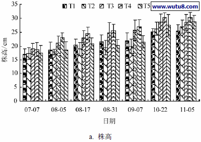 滴灌条件下,不同灌水下限对红掌株高和冠幅生长发育的影响分别如图4a 和图4b 所示。