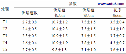2)供试条件下,处理间红掌的花朵数差异不大,均约为3 朵。灌水下限为基质持水量60%时,红掌佛焰苞大小未受影响,株高和冠幅分别显著增加19.3%和14.7%(p=0.05),提升了观赏品质。其余处理除灌水下限为基质持水率50%的处理减小了红掌的佛焰苞外,与灌水下限为基质持水率90%的处理差异不显著。