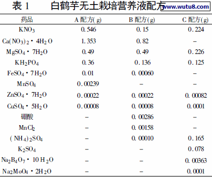 无土栽培基质材料为: 实心陶粒: 从建材店购入, 颗粒为不规则多面体, 红色, 体积约0. 065 cm3 , 总孔隙度51. 9%; 多孔陶粒: 从花木店购入, 颗粒球形, 体积约0. 629 cm3 , 总孔隙度60. 7%。两种陶粒按体积比1 : 1配制成白鹤芋的无土栽培基质, 栽培时实心陶粒铺在多孔陶粒上面。营养液设A、B、C 三个配方, 其药品用量如下: 将三个不同的配方中的Ca( NO3 ) 2 # 4H2O、大量元素和微量元素分装于三个瓶中, 配制成浓缩了100 倍的营养液原液。每次用前先用自来水稀释100 倍后, 用HNO3 将其pH 值调整至5. 5~ 6. 5。