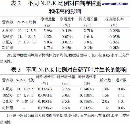 本试验采用了A、B、C 三种不同N、P、K 比例的营养液对白鹤芋进行了为期两个月无土栽培试验, 结果表明, 三个营养液配方在促进白鹤芋营养生长方面均有明显的效果, 其中以N、P、K 比例为10 B1 B5. 5 的A 配方效果最为显著。