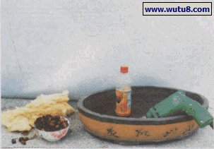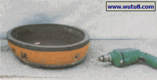 图3钻盆侧底孔。以金刚石钻具,用电钻打出10毫米孔,孔边离盆底10毫米。