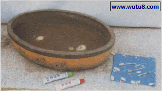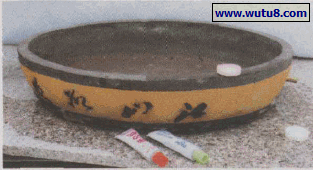 图2 堵住盆具底孔。用磁砖片,加工成四形,用环氧树脂,堵住盆底孔.胶住不漏水。