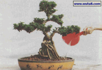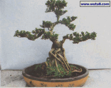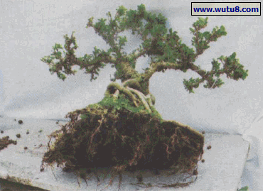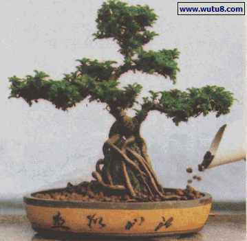 图11素材植入。将成型的金边翠榕(或其他树种)置入盆中适当位置,立稳。