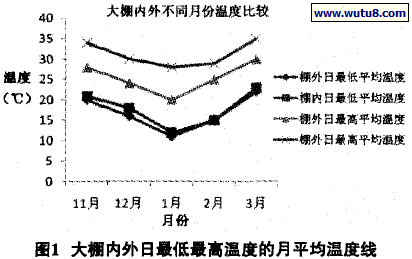 2.6 试验大棚内外日最高、最低月平均温度图1表明:棚内外日最低月平均温度线很接近,相差1—2℃,而棚内外日最高月平均温度线相差较远,棚内高出棚外5~8℃ ,棚内温度高于35℃采取遮阳水帘抽风降温。