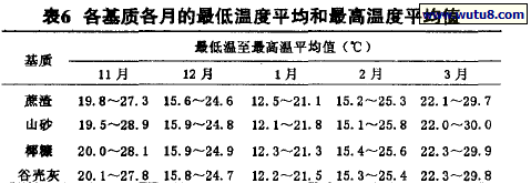 表6表明,各种基质各日的最低曲线温度平均值、最高温度平均值都非常接近,山砂各月的最低温度平均值最低,最高温度平均值最高,山砂是4种基质中受温度影响最大的,温度变化的稳定性最差。