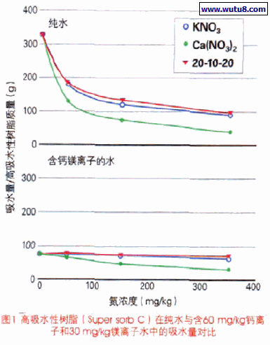 高吸水性树脂的吸水量取决于用于栽培植物的水质和肥,水中的盐分越高,高吸水性树脂的吸水能力越差。此外,水中的二价离子如钙离子、镁离子等会与高吸水性树脂发生化学反应,降低其吸水能力。例如,一种名为Supersorb C的高吸水性树脂,在纯水中能吸收相当于其重量330倍的水量。但是当水中含有60 mg/kg的钙离子和30 mg/kg的镁离子时,Supersorb C的吸水量仅为其重量的75倍。而当水中钙离子的含量上升至350 mg/kg时,Supersorb C的吸水量仅为其重量的30倍(如图1所示)。据数据分析,Supersorb C按照1.5 磅/立方码计算。一般而言,10 英寸的吊盆的容量是1.3 加仑。而每立方码的基质可填充160 个吊盆。按照此比率计算,每个10 英寸的吊盆需要4.25 g的Supersorb C。在纯水中,4.25 g的Supersorb C吸收水量为47 fl.oz.。而在含有钙镁离子的水中,4.25 g的Supersorb C吸收水量则为10 fl.oz.。当所施肥中又进一步增加钙离子含量时,4.25 g的Supersorb C吸收水量则降低为4 fl.oz.。