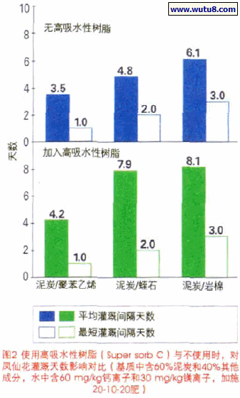 还是在10 英寸的垂吊盆栽凤仙花的实验中,在泥炭混合物基质中加入1.5 磅/立方码高吸水性树脂于泥炭混合物基质进行栽培对比,分别比较基质的持水量。经过11 周的栽培,灌溉水中含有60 mg/kg的钙离子和30 mg/kg的镁离子,所施的20-10-20肥料为300 mg/kg,每两周施一次肥。实验结果表明,高吸水性树脂并没有影响基质的持水量和最小灌溉间隔时间,因此,当基质中有效水量很高的时候,高吸水性树脂的使用效果就不明显。但是平均灌溉间隔在含有高吸水性树脂的基质栽培中明显增加(如图2 所示)。
