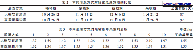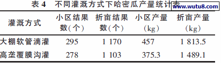 试验结果表明, 大棚软管滴灌栽培哈密瓜较高垄覆膜沟灌采摘期提前5 天; 每亩节约用水248.1t,节水66%;商品瓜亩产量较沟灌增产324.4 kg,增幅21.8%;亩增纯收入822 元。同时,大棚软管滴灌栽培哈密瓜还可以降湿防病, 并能显著提高商品瓜的外观和品质。