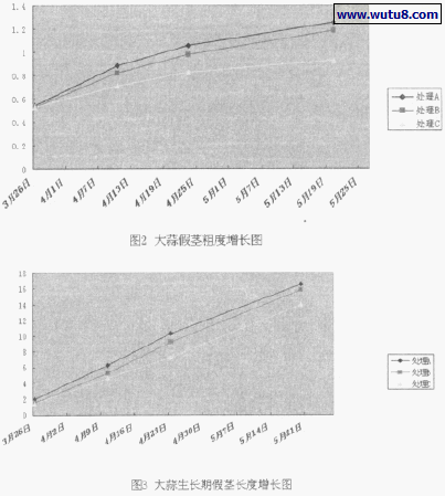 为了了解不同栽培方式对大蒜生育期生长速度的影响,我们定期对大蒜的生长情况进行观测,结果如图1、图2、图3 所示。