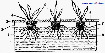 1.装食品的塑料箱2.溢水孔3.泡沫塑料定植板4.塑料定植杯5.小石砾 6.空隙7.液面 8.营养液