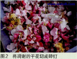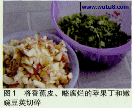 ①将苹果皮、香蕉皮、土豆皮、嫩豌豆荚、淮山药皮及枯萎的花瓣切成碎钉,颗粒越小越好(图1-2),