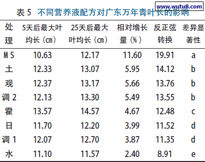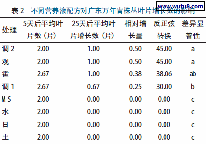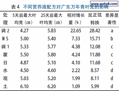 不显著,与调整配方1 差异显著。说明调整配方2、观叶植物营养液配方和霍格兰配方是适合广东万年青叶片增长的最佳营养液配方。