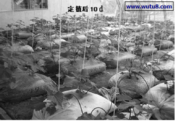 2008 年3 月23 日, 将栽培袋摆放于日光温室中, 在袋两侧开10 cm x10 cm 左右的定植孔, 并调整株行距为40 cm x 60 cm 左右。在幼苗定植后安装滴灌装置。