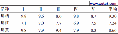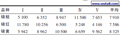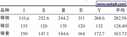 从表1 中可以看出,锦黄产量最高,每小区达8 325 g,平均每株产量416.25 g;锦桔次之,产量达7 910.4 g, 平均每株产量395.52 g; 锦红最少, 为7 586 g,平均每株产量379.3 g。从产量看,锦黄品种优于锦桔和锦红。