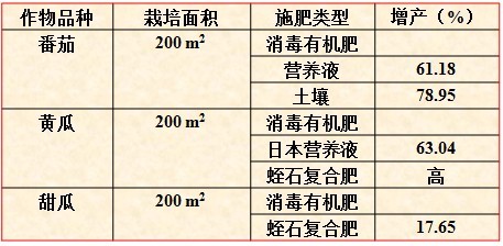 注:表中增产(%)一栏中的数据是指消毒有机肥与其他施肥类型相比,增产的百分数。如表中的61.18%指施消毒有机肥比用营养液增产61.18%。