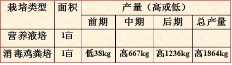 注:表中数据是消毒鸡粪培的产量与营养液培的产量的比较