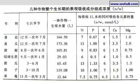 山崎通过每天测定正常生长植株各种营养元素(主要是大量元素)的吸收量(mmol/株·天)和植株的耗水量(L)。可以连续进行一段时间或植物一生中总共吸收了多少养分和水分,然后以此计算n/w。