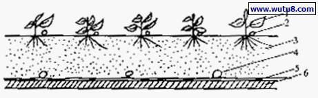 1.植株 2.薄壁滴灌带 3.沙 4.排液管 5.黑色塑料薄膜 6.温室地面
