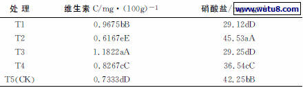 2.2.1 不同基质对莴苣维生素C含量的影响 维生素C是人体不可缺少的维生素,也是蔬菜产品重要的品质指标之一。由表3可知,不同处理间的维生素C含量存在着极显著的差异水平,其中T3处理维生素C含量最高,说明采用腐熟的秸秆作为莴苣无土栽培的基质,有利于莴苣品质的提升。