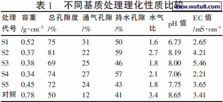 基质的适宜容重为0.15~0.8 g·cm-3。表1 结果表明,各处理基质均在适宜的范围之内,对照的容重最大,为0.78 g·cm-3。孔隙度是衡量基质物理性质的重要指标之一。基质适宜的总孔隙度在70%~90%,对照和S3 不在适宜范围内。理想基质的通气孔隙是在15%~30% 范围内,S1 最大,为31%,超出这一范围;对照低于这一范围;其余几种基质的通气孔隙都在这一范围内。理想基质的持水孔隙是在40%~75%的范围内,可以看出,各个处理基质都在这一范围内。S1 的水气比最小,说明旧有机基质∶ 菇渣(3 :2)的透气性好,但持水性差。大部分基质的pH 值偏碱。基质适宜的EC 值为小于2.6 mS/cm,S4 的EC值小于适宜的EC 值,其他处理基质的EC 值均超过作物适宜的EC 值范围。