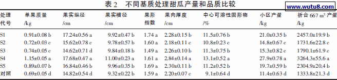 试验结果显示,各处理间的单果质量总体上差异显著,其中S4 的单果质量最大,比对照高66.7%。各处理间的果实纵径总体上差异显著;果实横径除S4 与其他各处理差异显著外,其他处理间差异均不显著;S4 的果实纵径和横径均达到最大值。果形指数处理间差异不显著,为1.49~1.74,果实均为长椭圆形,说明基质处理对甜瓜的果形影响不大。果肉厚度S4 最高,与其他各处理差异显著,S4 比对照高29.1%;对照与S2 之间差异不显著。中心可溶性固形物含量各处理间差异情况同果皮厚度,S4 比对照高4 个百分点。小区产量对照最低,S4 最高并显著高于其余各处理;其次为S1,再次为S5,两者显著高于S2 和S3。各处理折合667 m2 产量差异情况同小区产量,其中S4 折合667 m2 产量最高,达3 264.3kg,显著高于对照和其他处理。详见表2。