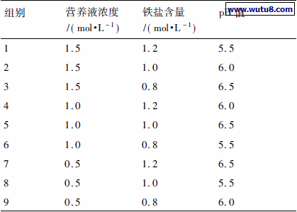 铁元素不仅能促进叶绿素的合成和植物根内硝酸还原,还是植物吸收氮和磷的限制因素[8]; 营养液浓度和pH 值在一定程度上影响着植物对矿质营养元素Fe3 +,Ca2 +,Mg2 + 等的吸收效率[9]。本试验在改良Hoagland 通用营养液配方[10]的基础上,设营养液浓度( 大量元素的浓度) 、铁盐含量和pH 值3 个因素,每个因素3 个水平,采用L9 ( 34 ) 正交试验进行组合,共9 个组合( 表1) ,并以清水为对照。Hoagland 配方中的大量元素A 液B 液分别配成1 L 100 倍母液,铁盐含量配成500 mL 1 倍液,微量元素配成1 L 1000 倍母液,母液采用去离子水配制,均盛与1 L棕色广口试剂瓶中备用,具体配方详见表2、表3、表4,常规Hoagland 营养液配方组合为1 倍大量元素1 L,1 倍铁盐2. 5 mL,1 倍微量元素5mL,调节pH 至6. 0[10]。按营养液配方正交试验表分别配制出9 种营养液。试验时,每种营养液处理百子莲10 株,重复3 次,待百子莲定植于无土基质中30 d 后,每2 周用根灌方式浇灌营养液1 次,每次每株100 mL,持续浇灌3 次。