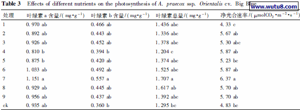 表3 数据显示: 各处理的叶绿素a 含量与对照组差异不显著; 处理7 的叶绿素b、叶绿素a + b的含量显著大于对照组,净光合速率最高,显著高于对照组,达6. 37 μmol CO2·m - 2·s - 1,其次是处理4,6,8,处理1 的净光合速率最低。