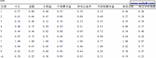 其中W i,j为第i 个处理第j 个观测指标的得分,Xj,i为第i 个处理第j 个观测指标的平均值,Xj,min 为第j 个观测指标平均值中的最小值,Xj,max 为第j个观测指标平均值中的最大值,将各个观测指标得分累加,求其平均值,即为该处理的综合评分,得分越高表明处理对植物生长越有利[13]。试验数据分析采用Excel 2003 和SPASS 19. 0 进方差分析、多重比较和图表绘制。