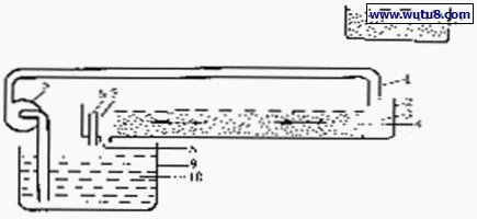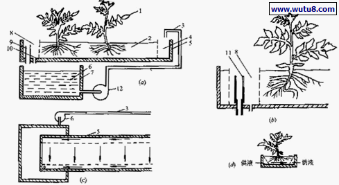 1.植株 2.基质(石砾) 3.供液管 4.供液缓冲间 5.种植槽 6.营养液 7.贮液池 8.排液缓冲间 9.溢出口 10.排液口 11.可调节高度的套管