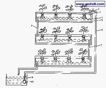 立体水培生产设施  1.植株 2.定植杯 3.定植板 4.营养液 5.种植槽 6.供液管 7、8层间种植槽排液及供液管 9.贮液池 10.水泵 立体水培生产设施示意图 P…