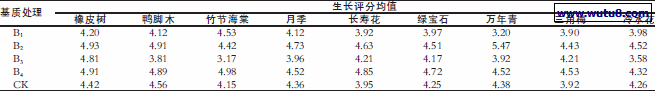 根据不同基质处理间植株生长状态获得的生长评分均值作方差分析比较,结果表明:在A 基质中培养的植株,除了喜水或水生的旱伞草、香蒲、萱草、菖蒲等外,大部分植株均生长不良。植株根系表现粗短,易腐烂。这与水里的含氧量不能满足根系的呼吸作用有关;同时,植株在水中,随着植株生长,支撑力差也是一个原因。在B 基质上培养的植株均生长良好。大多数植株表现叶绿,枝增多,特别是橡皮树、绿宝石、鸭脚木等,植株叶片浓绿,生长势极旺,并且叶片增长、增宽明显。在C 基质中培养的植株生长势介于2 级与3级之间,与B 基质中培养的植株比较,其生长量低,植株极少数萌枝。直观其叶片绿度降低。这可能是因为所用陶粒的团粒较大,团粒间的孔隙大,其保水性差,从而影响了植株的生长。
