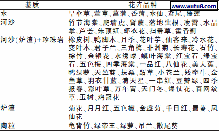 植物材料为扦插苗、播种苗、分株植物。基质材料中“水培”以水为主;“砂培”为沙、沙+珍珠岩(体积比为1∶1)、炉渣、炉渣+珍珠岩(体积比为1∶1),“砾培”以陶粒为主,土培以土为主。营养液中大量元素为Ca(NO3)2 0.492g/L、KNO30.202g/L、KH2PO4 0.136g/L、NH4NO30.04g/L、K2SO4 0.174g/L、MgSO4 0.12g/L; 微量元素为Fe 10mg/L、Mn 2.5mg/L、B2.5 mg/L、Zn 0.5mg/L、Cu 0.08mg/L、Mo 0.12mg/L。
