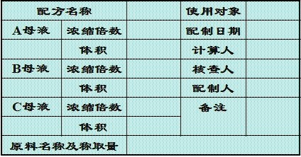 *A母液以钙盐为中心,凡不与钙作用而产生沉淀的盐都可放在一起。B母液以磷酸盐为中心,凡不与磷酸根形成沉淀的都可放在一起。 C母液是由铁和微量元素合在一起配制而成的。