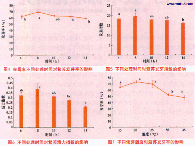 用200 mg/L的赤霉素(根据1.2.1的结果选定)浸泡紫苏种子6 h、8 h、10 h、12h、14 h,每个处理100 粒,重复3 次,催芽法方与测定方法同1.2.1。