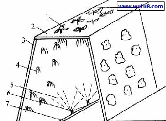 1.植株 2、3.泡沫塑料板 4.根系 5.雾状营养液 6.喷头 7.供液管 地上部分8.地面