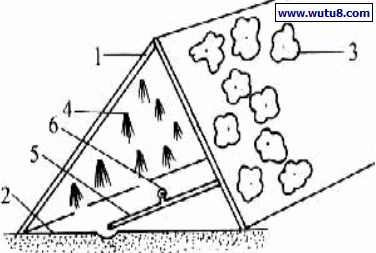 1.泡沫塑料板 2.塑料薄膜 3.结球生菜 4.根系 5.供液管 6.喷头