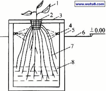 1.植株 2.定植杯 3.定植板 4.喷头5.种植槽 6.地面 7.根系 8.营养液层
