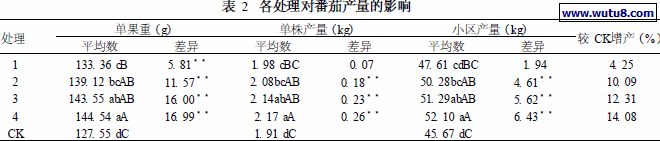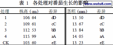不同处理对番茄株高茎粗影响的测定结果表明(表1) ,施用EM原露能够不同程度地提高番茄株高和茎粗生长量,各处理间促进效果差异极显著,同时表明对番茄株高和茎粗的促进作用随EM原露施用量增加而增大。