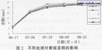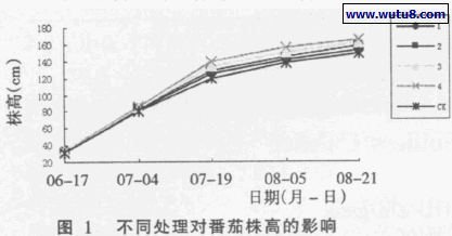 试验于2004年5~9月,在山西省农科学院农业高新技术园区连栋温室内进行。供试品种为豫艺红将军。栽培基质为泥炭n 蛭石= 2 n 1(体积比) ,每立方米基质中施入消毒鸡粪8. 5kg,复合肥1. 0 kg,二铵0. 25 kg。小区(种植槽)面积0. 48 m ×6. 0 m,小区基质用量0. 52 m3 ,小区种植株数24株。4月12日播种,穴盘育苗, 5月16日定植,采收至5穗果。EM原露由江西省天意生物技术开发有限公司生产。试验设计按每立方米EM原露用量设置5个处理: 1 (200 ml) , 2 (400 ml) , 3 (600 ml) , 4(800 ml) , CK(0 ml) 。随机区组排列,重复3次。EM原露对水200倍,定植前1 d混入基质装填种植槽。地膜覆盖,膜下滴灌,单秆整枝,常规管理。定植一个月后开始随机抽取10株测定株高和茎粗,以后每15 d测定1次,共测定5次。采收时测定单果重,按小区计产。调查数据采用LSD和LSR法分析。